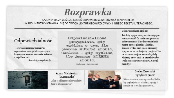 KAŻDY BYWA ZA COŚ LUB KOGOŚ ODPOWIEDZIALNY. ROZWAŻ TEN PROBLEM. W ARGUMENTACH ODWOŁAJ SIĘ DO DWÓCH LEKTUR OBOWIĄZKOWYCH I INNEGO TEKSTU LITERACKIEGO.