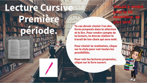 Tu vas devoir choisir l'un des livres proposés dans la sélection et le lire. Pour rendre compte de ta lecture, tu devras réaliser le travail de ton choix qui sera noté. Pour choisir ta restitution, clique sur le stylo pour voir toutes les possibilités. Pour voir les lectures proposées, clique sur le livre ouvert.