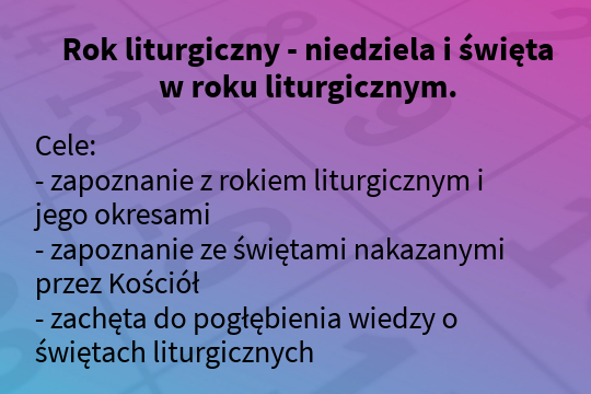 Cele: - zapoznanie z rokiem liturgicznym i jego okresami - zapoznanie ze świętami nakazanymi przez Kościół - zachęta do pogłębienia wiedzy o świętach liturgicznych