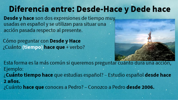 Desde y hace son dos expresiones de tiempo muy usadas en español y se utilizan para situar una acción pasada respecto al presente.