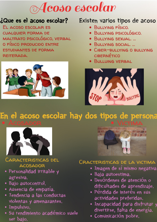 El acoso escolar es cualquier forma de maltrato psicológico, verbal o físico producido entre estudiantes de forma reiterada.