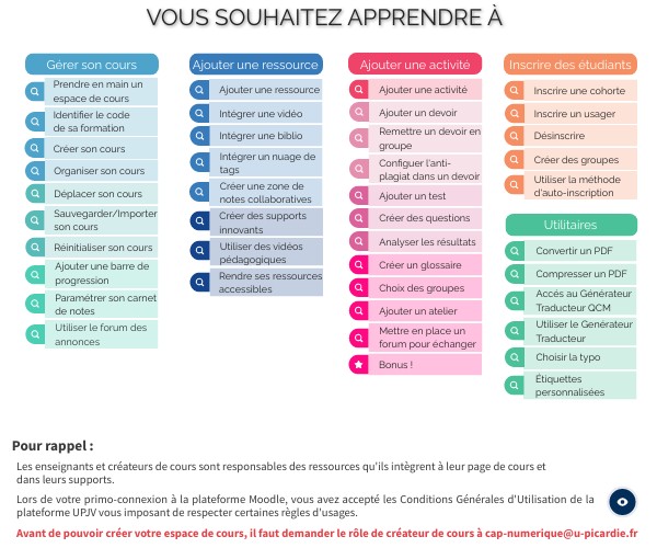 Les enseignants et créateurs de cours sont responsables des ressources qu'ils intègrent à leur page de cours et dans leurs supports.