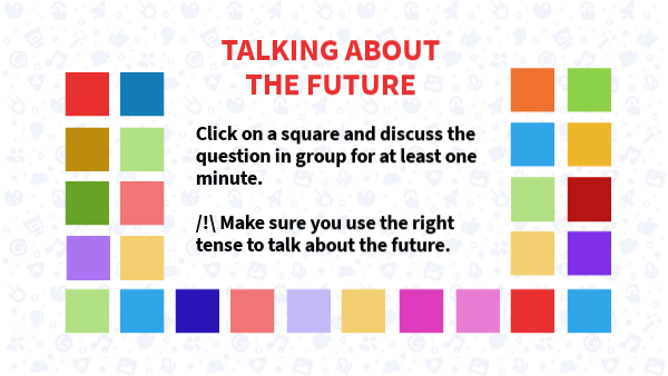 Click on a square and discuss the question in group for at least one minute. /!\ Make sure you use the right tense to talk about the future.