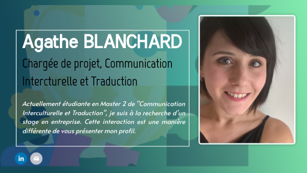 Actuellement étudiante en Master 2 de "Communication Interculturelle et Traduction", je suis à la recherche d’un stage en entreprise. Cette interaction est une manière différente de vous présenter mon profil.