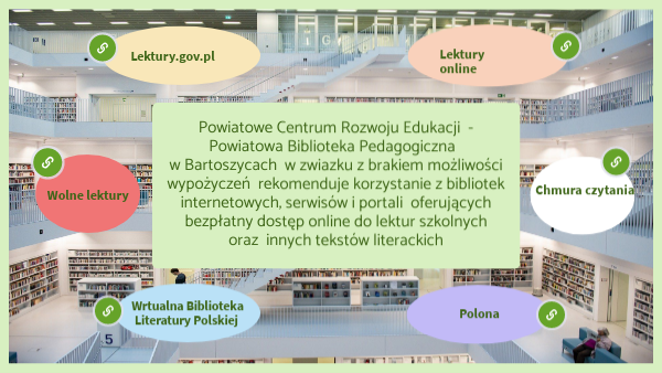 Powiatowe Centrum Rozwoju Edukacji - Powiatowa Biblioteka Pedagogiczna w Bartoszycach w zwiazku z brakiem możliwości wypożyczeń rekomenduje korzystanie z bibliotek internetowych, serwisów i portali oferujących bezpłatny dostęp online do lektur szkolnych oraz innych tekstów literackich
