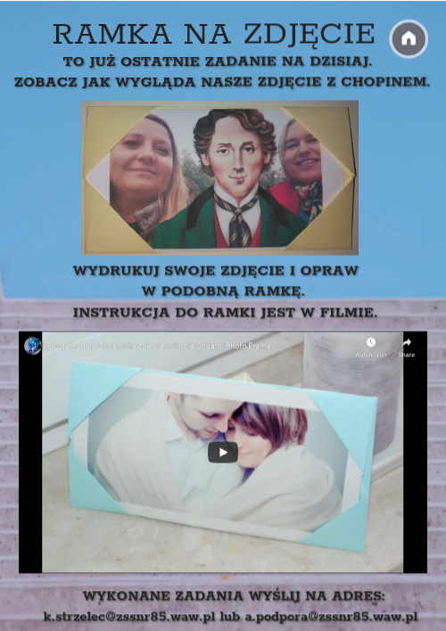 TO JUŻ OSTATNIE ZADANIE NA DZISIAJ. ZOBACZ JAK WYGLĄDA NASZE ZDJĘCIE Z CHOPINEM. WYDRUKUJ SWOJE ZDJĘCIE I OPRAW W PODOBNĄ RAMKĘ. INSTRUKCJA DO RAMKI JEST W FILMIE.