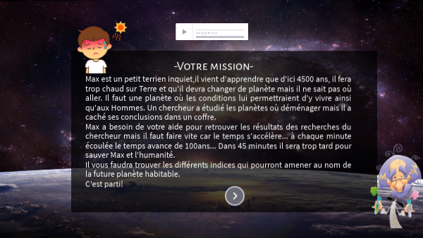 Max est un petit terrien inquiet : il vient d'apprendre que d'ici 4500 ans, il fera trop chaud sur Terre et il devra changer de planète... mais il ne sait pas où aller ! Il faut une planète où les conditions lui permettraient d'y vivre ainsi qu'aux Hommes. Un chercheur a étudié les planètes où déménager mais il a caché ses conclusions dans un coffre. Max a besoin de votre aide pour retrouver les résultats des recherches du chercheur mais il faut faire vite car le temps s'accélère... à chaque minute écoulée le temps avance de 100ans... Dans 45 minutes il sera trop tard pour sauver Max et l'humanité. Il vous faudra trouver les différents indices qui pourront amener au nom de la future planète habitable. C'est parti !-