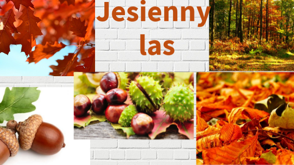 Jesienią, jesienią lecą liście na ziemię, lecą jabłka czerwone, liście żółtozielone. Jesienią, jesienią lecą z dzrewa na ziemię wielkie twarde kasztany, w liściach leżą schowane. Jesień chodzi po lesie, zbiera grzyby brązowe, wiatr koszyki jej niesie i orzechy w nie chowa.