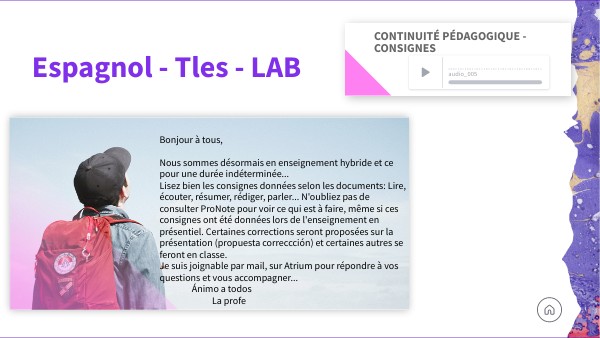 Bonjour à tous, Nous sommes désormais en enseignement hybride et ce pour une durée indéterminée... Lisez bien les consignes données selon les documents: Lire, écouter, résumer, rédiger, parler... N'oubliez pas de consulter ProNote pour voir ce qui est à faire, même si ces consignes ont été données lors de l'enseignement en présentiel. Certaines corrections seront proposées sur la présentation (propuesta correccción) et certaines autres se feront en classe. Je suis joignable par mail, sur Atrium pour répondre à vos questions et vous accompagner... Ánimo a todos La profe