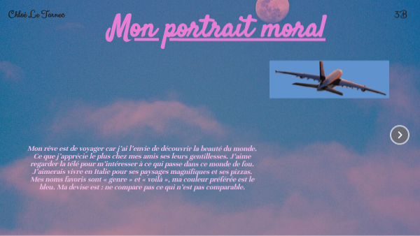 Mon rêve est de voyager car j’ai l’envie de découvrir la beauté du monde. Ce que j’apprécie le plus chez mes amis ses leurs gentillesses. J’aime regarder la télé pour m’intéresser à ce qui passe dans ce monde de fou. J’aimerais vivre en Italie pour ses paysages magnifiques et ses pizzas. Mes noms favoris sont « genre » et « voilà », ma couleur préférée est le bleu. Ma devise est : ne compare pas ce qui n’est pas comparable.