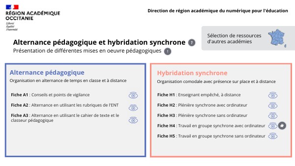 Fiche H1 : Enseignant empêché, à distanceFiche H2 : Plénière synchrone avec ordinateurFiche H3 : Plénière synchrone sans ordinateurFiche H4 : Travail en groupe synchrone avec ordinateurFiche H5 : Travail en groupe synchrone sans ordinateur