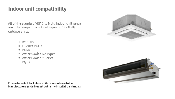 All of the standard VRF City Multi Indoor unit range are fully compatible with all types of City Multi outdoor units: