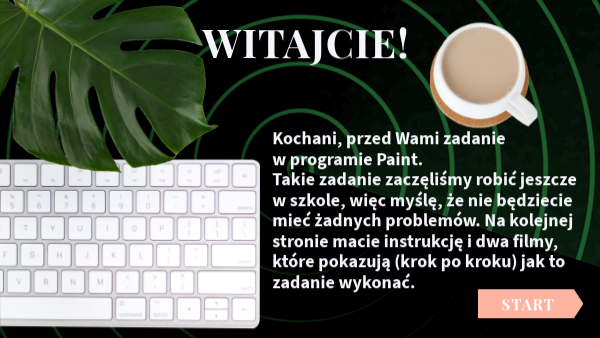 Kochani, przed Wami zadanie w programie Paint. Takie zadanie zaczęliśmy robić jeszcze w szkole, więc myślę, że nie będziecie mieć żadnych problemów. Na kolejnej stronie macie instrukcję i dwa filmy, które pokazują (krok po kroku) jak to zadanie wykonać.