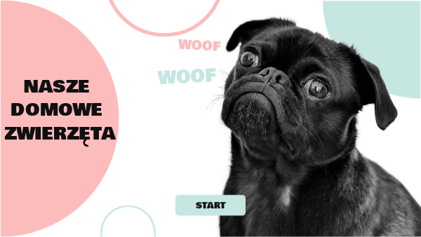 papuga, żółw, duży pies (wyżeł), mały pies (mops), rybki, dwa koty