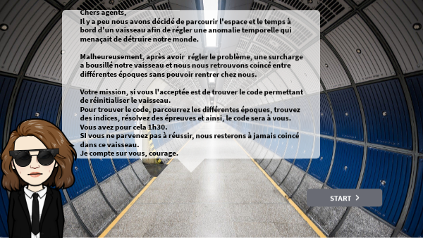 Chers agents, Il y a peu nous avons décidé de parcourir l'espace et le temps à bord d'un vaisseau afin de régler une anomalie temporelle qui menaçait de détruire notre monde. Malheureusement, après avoir régler le problème, une surcharge a bousillé notre vaisseau et nous nous retrouvons coincé entre différentes époques sans pouvoir rentrer chez nous. Votre mission, si vous l'acceptée est de trouver le code permettant de réinitialiser le vaisseau. Pour trouver le code, parcourrez les différentes époques, trouvez des indices, résolvez des épreuves et ainsi, le code sera à vous. Vous avez pour cela 1h30. SI vous ne parvenez pas à réussir, nous resterons à jamais coincé dans ce vaisseau. Je compte sur vous, courage.