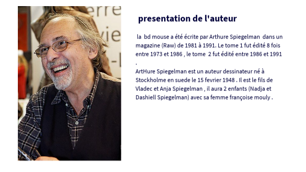 la bd mouse a été écrite par Arthure Spiegelman dans un magazine (Raw) de 1981 à 1991. Le tome 1 fut édité 8 fois entre 1973 et 1986 , le tome 2 fut édité entre 1986 et 1991 . ArtHure Spiegelman est un auteur dessinateur né à Stockholme en suede le 15 fevrier 1948 . Il est le fils de Vladec et Anja Spiegelman , il aura 2 enfants (Nadja et Dashiell Spiegelman) avec sa femme françoise mouly .