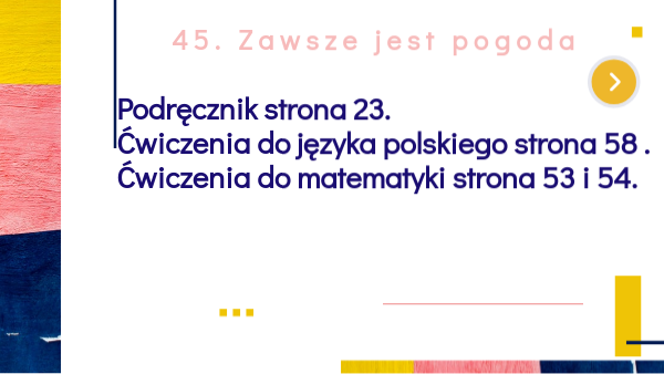 Podręcznik strona 23. Ćwiczenia do języka polskiego strona 58 . Ćwiczenia do matematyki strona 53 i 54.