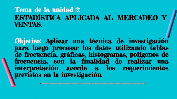 Tema de la unidad 2: ESTADÍSTICA APLICADA AL MERCADEO Y VENTAS. Objetivo: Aplicar una técnica de investigación para luego procesar los datos utilizando tablas de frecuencia, gráficas, histogramas, polígonos de frecuencia, con la finalidad de realizar una interpretación acorde a los requerimientos previstos en la investigación.