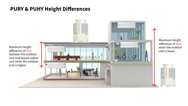 Maximum Height difference between Outdoor unit and furthest Indoor unit when the Outdoor is higher 50m. 40m maximum height difference when the Outdoor unit is Lower than the Indoors