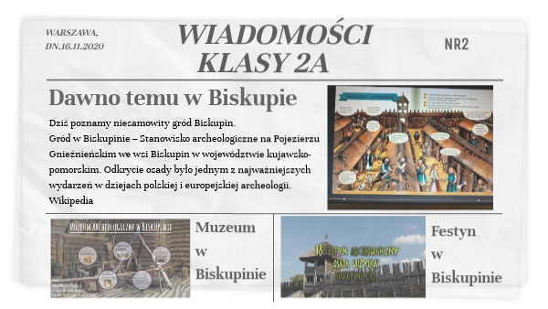 Dziś poznamy niesamowity gród Biskupin.Gród w Biskupinie – Stanowisko archeologiczne na Pojezierzu Gnieźnieńskim we wsi Biskupin w województwie kujawsko-pomorskim. Odkrycie osady było jednym z najważniejszych wydarzeń w dziejach polskiej i europejskiej archeologii. Wikipedia