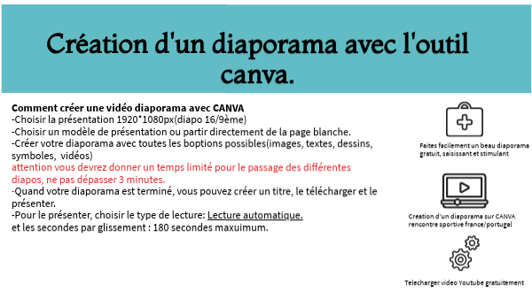 Comment créer une vidéo diaporama avec CANVA -Choisir la présentation 1920*1080px(diapo 16/9ème) -Choisir un modèle de présentation ou partir directement de la page blanche. -Créer votre diaporama avec toutes les boptions possibles(images, textes, dessins, symboles, vidéos) attention vous devrez donner un temps limité pour le passage des différentes diapos, ne pas dépasser 3 minutes. -Quand votre diaporama est terminé, vous pouvez créer un titre, le télécharger et le présenter. -Pour le présenter, choisir le type de lecture: Lecture automatique. et les secondes par glissement : 180 secondes maxuimum.