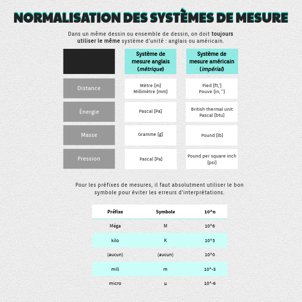 Dans un même dessin ou ensemble de dessin, on doit toujours utiliser le même système d'unité : anglais ou américain.