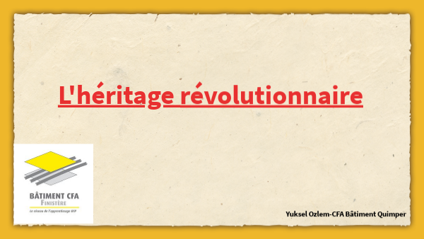 - Les valeurs léguées par la Révolution française sont la liberté et l'égalité. - La Révolution française nous a aussi légué le principe de séparation des pouvoirs, les pouvoirs législatif, exécutif et judiciaire ne peuvent pas être aux mains d'un seul home.