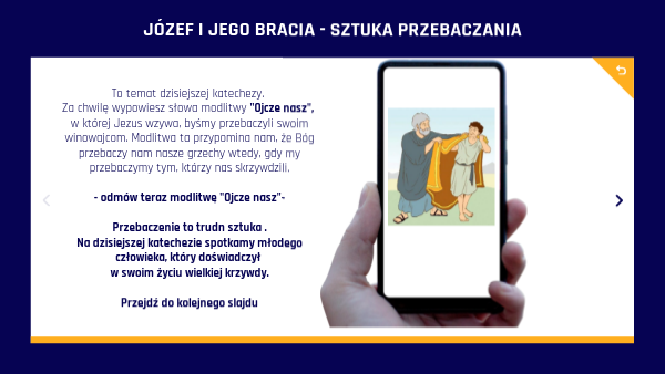 To temat dzisiejszej katechezy. Za chwilę wypowiesz słowa modlitwy "Ojcze nasz", w której Jezus wzywa, byśmy przebaczyli swoim winowajcom. Modlitwa ta przypomina nam, że Bóg przebaczy nam nasze grzechy wtedy, gdy my przebaczymy tym, którzy nas skrzywdzili. - odmów teraz modlitwę "Ojcze nasz"- Przebaczenie to trudn sztuka . Na dzisiejszej katechezie spotkamy młodego człowieka, który doświadczył w swoim życiu wielkiej krzywdy. Przejdź do kolejnego slajdu
