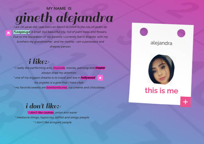 * I really like performing arts, musicals, movies, painting and theater always draw my attention * one of my biggest dreams is to travel and live in hollywood los angeles is a goal that I have clear. * my favorite sweets are bombombunes, ice creams and chocolates.