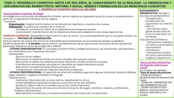 TEMA 5: DESARROLLO COGNITIVO HASTA LOS SEIS AÑOS. EL CONOCIMIENTO DE LA REALIDAD. LA OBSERVACION Y EXPLORACION DEL MUNDO FÍSICO, NATURAL Y SOCIAL. GÉNESIS Y FORMACION DE LOS PRINCIPALES CONCEPTOS