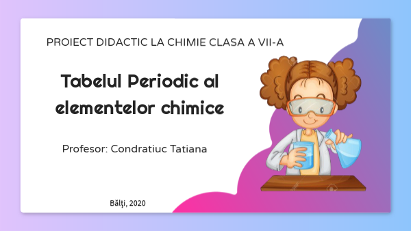 Profesor: Condratiuc Tatiana Clasa: a VII-a Obiectul: Chimia Modulul: Tabelul Periodic al elementelor chimice și structura atomului. Subiectul lecției: Tabelul Periodic al elementelor chimice. Tipul lecţiei: mixtă Unități de competență: 1. Operarea, în diferite situaţii de comunicare, cu elemente noi de limbaj chimic: grupă, subgrupă principală /secundară, perioadă, metal, nemetal, număr de ordine/număr atomic. 2. Caracterizarea elementelor chimice cu numerele atomice 1-20, în baza algoritmului: a) poziția în Tabelul Periodic (denumirea, simbolul chimic, numărul atomic, masa atomică relativă, perioada, grupa, subgrupa, caracterul metalic sau nemetalic). 3. Investigarea experimentală a proprietăților fizice ale metalelor și nemetalelor în baza mostrelor de substanțe.
