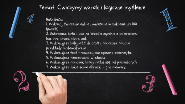 NaCoBeZu:1. Wykonaj ćwiczenie online : mnożenie w zakresie do 100 (puzzle). 2. Ustawiasz kota i psa na krześle zgodnie z poleceniami (na, pod, przed, obok, za). 3. Wykonujesz kolejność działań i obliczasz podane przykłady matematyczne. 4. Wykonujesz test - wskazujesz opisane zwierzęta. 5. Wskazujesz rzeczowniki w zdaniu. 6. Wskazujesz obrazek, który różni się od pozostałych. 7. Wskazujesz takie same obrazki - gra memory.