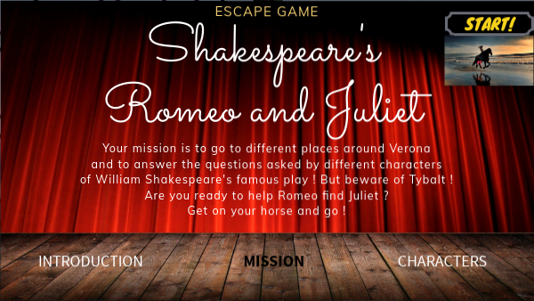 Your mission is to go to different places around Verona and to answer the questions asked by different characters of William Shakespeare's famous play ! But beware of Tybalt ! Are you ready to help Romeo find Juliet ? Get on your horse and go !