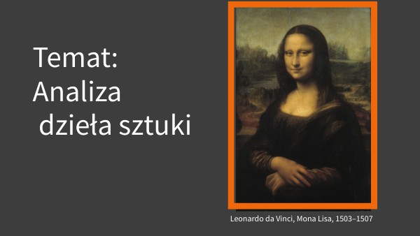 Zidentyfikuj reprodukcje dzieł sztuki ukazanych w prezentacji. Wypisz:- tytuł, - autor dzieła, - rok powstania lub wiek/epoka - technika wykonania dzieła, - format, wymiary - miejsce, gdzie znajduje się oryginał, - styl, konwencja w jakim dzieło sztuki zostało wykonane