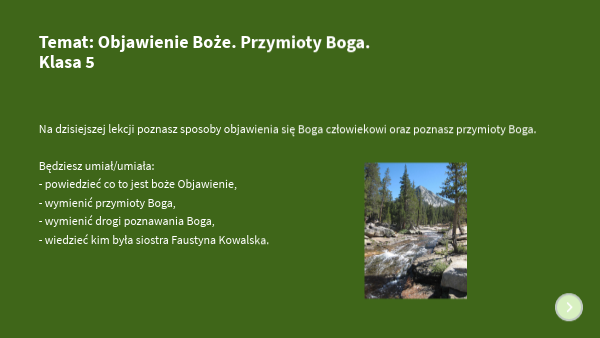 Na dzisiejszej lekcji poznasz sposoby objawienia się Boga człowiekowi oraz poznasz przymioty Boga. Będziesz umiał/umiała: - powiedzieć co to jest boże Objawienie, - wymienić przymioty Boga, - wymienić drogi poznawania Boga, - wiedzieć kim była siostra Faustyna Kowalska.