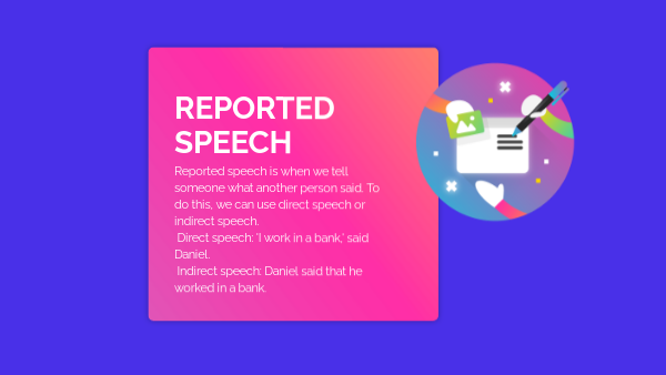 Reported speech is when we tell someone what another person said. To do this, we can use direct speech or indirect speech. Direct speech: 'I work in a bank,' said Daniel. Indirect speech: Daniel said that he worked in a bank.