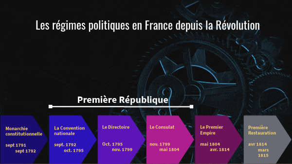 La Première République est le régime politique fondé par la Révolution et ayant dirigé la France du 21 septembre 1792 au 18 mai 1804.Elle a connu trois formes de gouvernements : 1- La Convention nationale : Le pouvoir est essentiellement aux mains du Comité de Salut public. C'est pendant cette période qu'a lieu la Terreur. 2- Le Directoire fondé par la Constitution de l'an III. Le pouvoir est exercé par cinq directeurs et deux assemblées élues au suffrage censitaire. Il est renversé par le coup d'État du 18 brumaire an VIII organisé par Bonaparte et son entourage. 3- Le Consulat, de 1799 à 1804, gouverné par trois consuls. Peu à peu, Napoléon Bonaparte prend tous les pouvoirs en devenant Premier consul, puis Consul à vie en 1802. En 1804, une nouvelle constitution fait de la France un Empire avec Napoléon Bonaparte comme empereur.