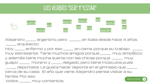 Alejandro ______ argentino, pero _______ en Italia desde hace 4 años. ______ arquitecto. Hoy ______ enfermo y por eso ______ en cama, porque su trabajo ______ muy estresante. Tiene muchos amigos porque ______ muy simpático y además tiene mucha suerte con las chicas porque ______ muy guapo: ______ moreno y ______ delgado, pero tiene músculos pues ______ deportista. Le gusta hacer deporte en el gimnasio que ______ cerca de su casa. El año que viene Alejandro piensa visitar a su familia. Por eso todos _______ muy contentos.
