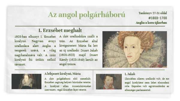 1603-ban elhunyt I. Erzsébet királynő. Negyven évnyi uralkodása alatt Anglia a tengerek urává, a világ nagyhatalmává vált. A szűz királynő fiú örökös nélkül távozott.