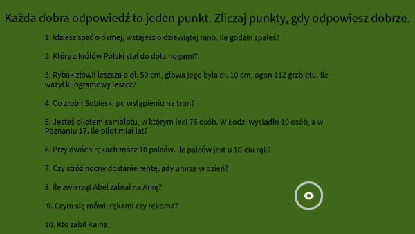 Każda dobra odpowiedź to jeden punkt. Zliczaj punkty, gdy odpowiesz dobrze.