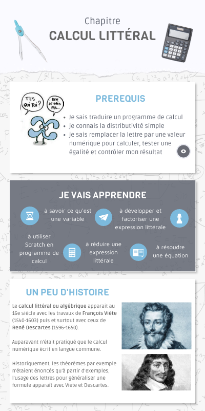 Le calcul littéral ou algébrique apparait au 16e siècle avec les travaux de François Viète (1540-1603) puis et surtout avec ceux de René Descartes (1596-1650).Auparavant n'était pratiqué que le calcul numérique écrit en langue commune. Historiquement, les théorèmes par exemple n'étaient énoncés qu'à partir d'exemples, l'usage des lettres pour généraliser une formule apparaît avec Viete et Descartes.