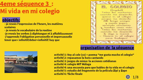 activité 1: Voy al cole (co) + poema "me gusta mucho el colegio" activité 2: repasamos la hora cantando activité 3: juegos de mimo: la acciones cotidianas activité 4: colegio MIT Málaga activité 4: una encuesta para que hables de tu vida en el colegio activité 5: estudio del fragmento de la película Zipi y Zape activité 6: Tâche finale