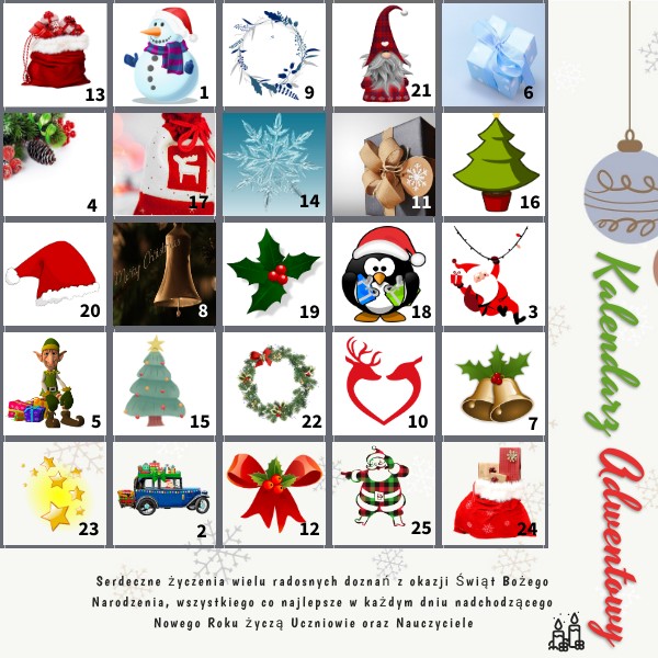 Serdeczne życzenia wielu radosnych doznań z okazji Świąt Bożego Narodzenia, wszystkiego co najlepsze w każdym dniu nadchodzącego Nowego Roku życzą Uczniowie oraz Nauczyciele