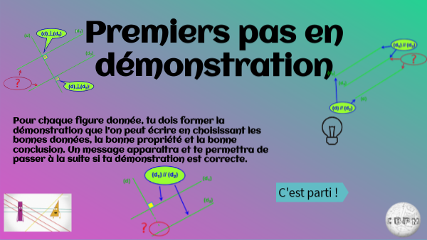 Pour chaque figure donnée, tu dois former la démonstration que l'on peut écrire en choisissant les bonnes données, la bonne propriété et la bonne conclusion. Un message apparaîtra et te permettra de passer à la suite si ta démonstration est correcte.