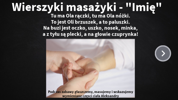 Podczas zabawy głaszczemy, masujemy i wskazujemy wymieniane częsci ciała Aleksandry