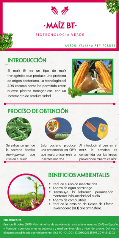 El maíz Bt es un tipo de maíz transgénico que produce una proteína de origen bacteriano. La tecnología del ADN recombinante ha permitido crear nuevas plantas transgénicas, con un incremento de productividad.