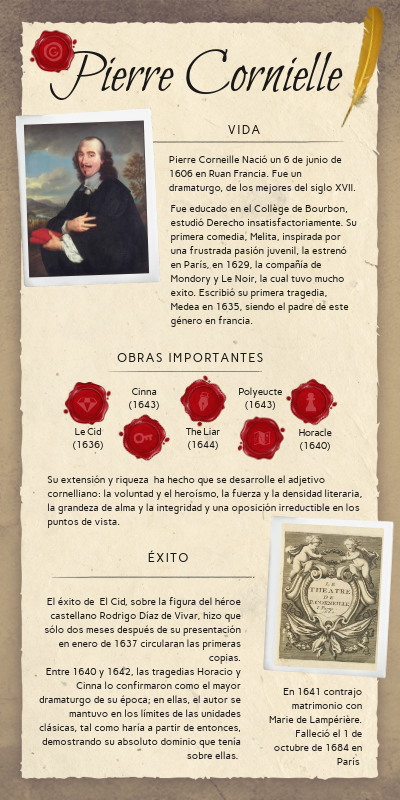 Pierre Corneille Nació un 6 de junio de 1606 en Ruan Francia. Fue un dramaturgo, de los mejores del siglo XVII.