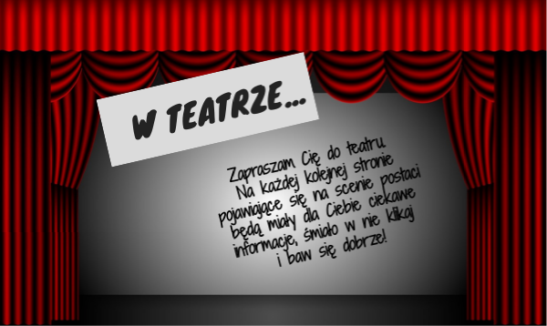 Zapraszam Cię do teatru. Na każdej kolejnej stronie pojawiające się na scenie postaci będą miały dla Ciebie ciekawe informacje, śmiało w nie klikaj i baw się dobrze!