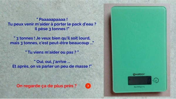 " Paaaaapaaaa ! Tu peux venir m'aider à porter le pack d'eau ? Il pèse 3 tonnes !" " 3 tonnes ! Je veux bien qu'il soit lourd, mais 3 tonnes, c'est peut-être beaucoup ..." " Tu viens m'aider ou pas ? " " Oui, oui, j'arrive ... Et après, on va parler un peu de masse !"