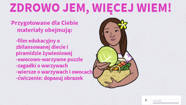 -film edukacyjny o zbilansowanej diecie i piramidzie żywieniowej -owocowo-warzywne puzzle -zagadki o warzywach -wiersze o warzywach i owocach -ćwiczenie: dopasuj obrazek